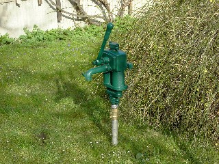 1.) Handpumpe für die Gartenversorgung, zum Befüllen von Fässern und Regentonnen und für die Gießkanne