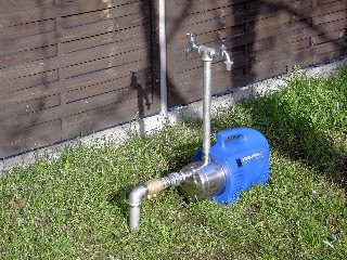 4.) Automatische Gartenwasserversorgung - Hauswasserpumpe mit Durchflußschalter. Die Pumpe schaltet ein, sobald ein Wasserhahn geöffnet wird und bleibt in Betrieb, bis die Wasserentnahme eingestellt wird. Diese Bauform ist geeignet, wenn eine konstante Wassermenge benötigt wird.