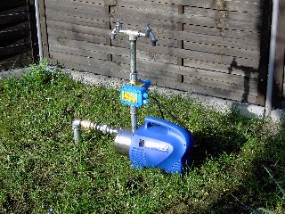 4.) Automatische Gartenwasserversorgung - Hauswasserpumpe mit Durchflußschalter. Die Pumpe schaltet ein, sobald ein Wasserhahn geöffnet wird und bleibt in Betrieb, bis die Wasserentnahme eingestellt wird. Diese Bauform ist geeignet, wenn eine konstante Wassermenge benötigt wird.